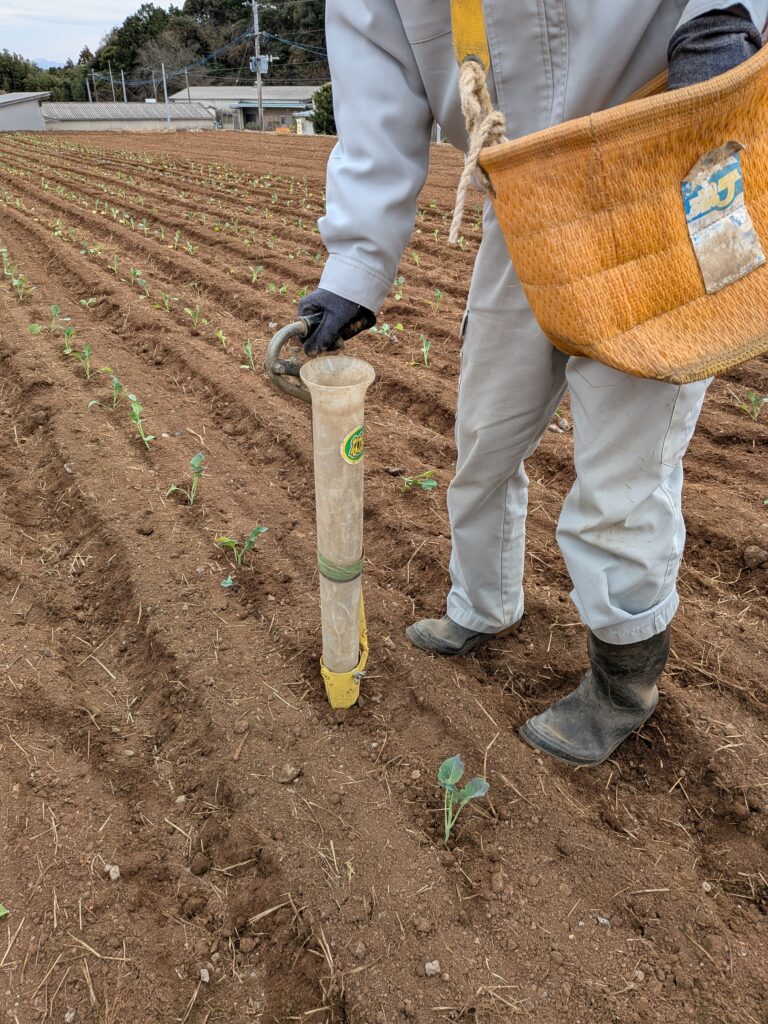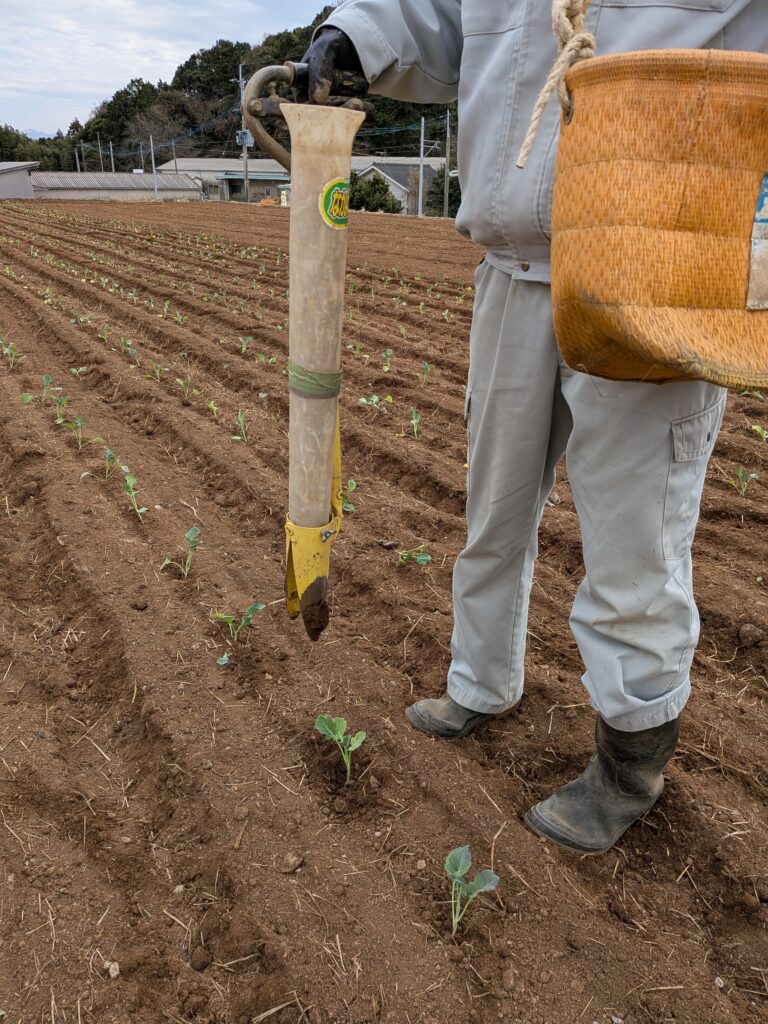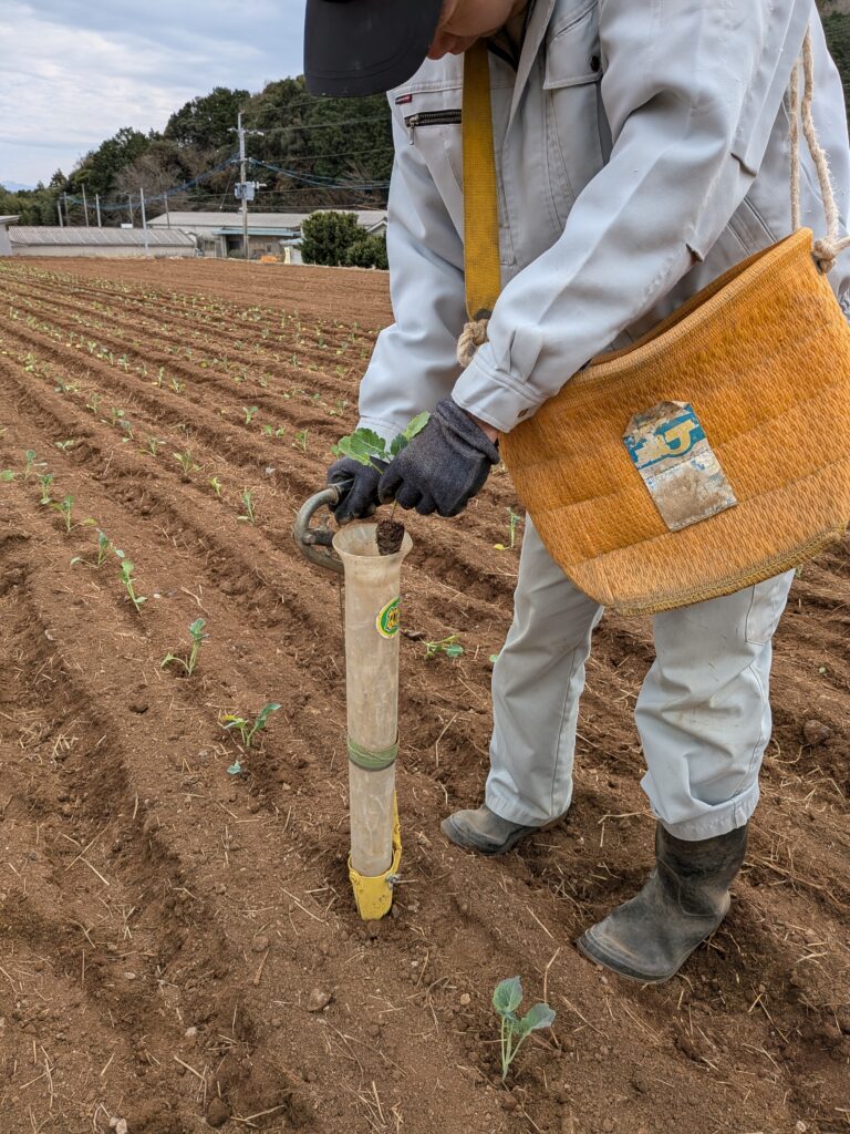機械で定植を行った後、苗が入っていない“抜け”の部分を、補植器を使用して補っていきます。