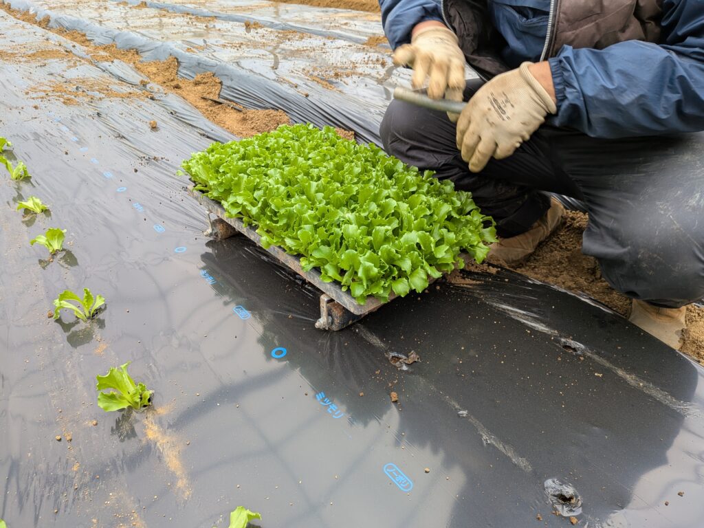 今回は、定植の精度と作業効率を高めるため、治具を使用しての作業となりました。